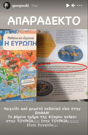 Πρόκειται για πληροφορίες σχετικά με την Κύπρο που αναγράφονται στο συγκεκριμένο βιβλίο ιστορίας. Κάτω από την επικεφαλίδα «ΚΥΠΡΟΣ» το βιβλίο γράφει: «Η Κύπρος είναι νησί της Μεσογείου και το βόρειο τμήμα της ανήκει στην Τουρκία».