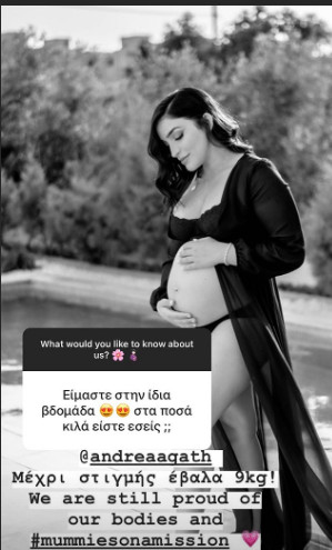 Η γνωστή χορεύτρια βρίσκεται στον 6ο μήνα της εγκυμοσύνης της και δεν διστάζει να μοιραστεί με τους διαδικτυακούς της φίλους πληροφορίες για την προσωπική της ζωή. Σε story της στο Instagram παρότρυνε τους ακολούθους της να της κάνουν ότι ερωτήσεις επιθυμούν, κι έτσι μια άλλη εγκυμονούσα που είναι στον ίδιο μήνα με την Άντρεα της ζήτησε να μοιραστεί μαζί της πόσα κιλά έβαλε κατά τη διάρκεια της εγκυμοσύνης. Η μέλλουσα μητέρα της απάντησε πως έχει βάλει 9 κιλά μέχρι στιγμής. Επίσης έγραψε στο story της «We are still proud of our bodies and #mummiesonamission », υπενθυμίζοντας όλες τις γυναίκες πως πρέπει να είναι περήφανες για το σώμα τους και πως σε μία εγκυμοσύνη σκοπός της γυναίκας είναι να φέρουν στη ζωή τη μικρή τους ευτυχία!