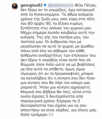 Συγκεκριμένα ο ηθοποιός θέλησε να απαντήσει στον ακόλουθό του, o οποίος σχολίασε το ντύσιμό του, αλλά και την καταγωγή του στα Κοκκινοχώρια, γράφοντας “Είδες πολύ ντυμένους έτσι στο Nissi beach. Και τί εννοείς για τα Κοκκινοχώρια” συνεχίζοντας το κείμενο του με υβριστικά σχόλια.