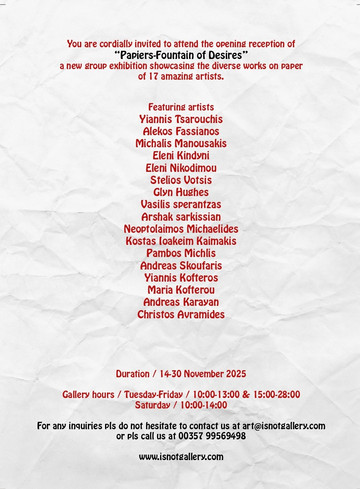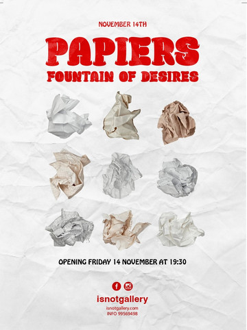 Η έκθεση Papiers – Fountain of Desires συγκεντρώνει έργα σε χαρτί δεκαεπτά καλλιτεχνών, διαφορετικών γενεών και εικαστικών προσεγγίσεων. Τα εγκαίνια θα πραγματοποιηθούν την Παρασκευή, 14 Νοεμβρίου, η ώρα 19:30, στην Isnotgallery.