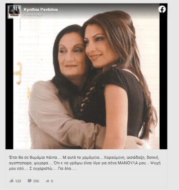 «Έτσι θα σε θυμάμαι πάντα…. Μ αυτό το χαμόγελο… Χαρούμενη, αισιόδοξη, δοτική, αγαπησιαρα, ψυχαρα…. Ότι κ να γράψω είναι λίγο για σένα ΜΑΝΟΥΛΑ μου… Ψυχή μου εσύ…. Σ ευχαριστώ…. Για όλα…..»