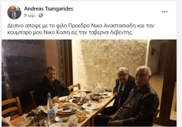 Ο φωτογραφικός φακός απαθανάτισε τον Πρόεδρο Αναστασιάδη παρέα με τον πρώην Υπουργό Δικαιοσύνης Νίκο Κόσιη και τον επιχειρηματία Αντρέα Τσαγκαρίδη να απολαμβάνουν το φαγητό τους στην ταβέρνα “Λεβέντης.”