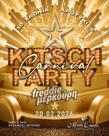 Tην Παρασκευή 20 Φεβρουαρίου, το Kitsch Party Carnival 2026 παρουσιάζει τους μοναδικούς DJs Freddie Μερκούρη στο Monte Caputo στη Λεμεσό το οποίο μετατρέπεται σε disco inferno ξανά. Με opening set από τον DJ Bereck, ένα επετειακό πάρτυ στήνεται εδώ και καιρό για να απογειώσει το φετινό καρναβάλι.