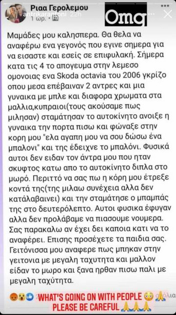 Συγκεκριμένα, αυτή η γυναίκα αφηγήθηκε ένα περιστατικό βγαλμένο από ταινία τρόπου για μια μητέρα. Στην ανάρτηση ανέφερε ότι δύο άνδρες και μία γυναίκα προσπάθησαν να απαγάγουν το παιδί της δωρίζοντας του ένα μπαλόνι. Ευτυχώς, ο πατέρας του παιδιού βρισκόταν εκει δίπλα και όταν είδε τι συνέβη πήγε κοντά στο παιδί του και οι δράστες έφυγαν.