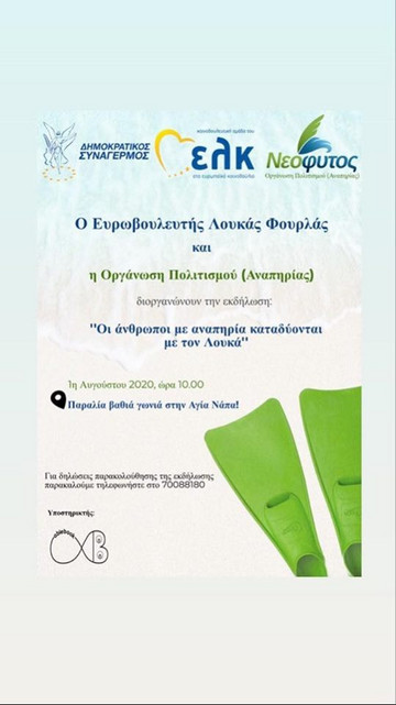 Ο Λουκάς Φουρλάς, μαζί με δυο νέα παιδιά με κινητικά προβλήματα καταδύθηκε στην παραλία της “Βαθειάς Γωνιάς” στην Αγία Νάπα, στέλνοντας το μήνυμα πως η προσβασιμότητα αποτελεί αδιαπραγμάτευτο δικαίωμα τους. Δείτε την σχετική ανάρτηση και φωτογραφίες από την εκδήλωση