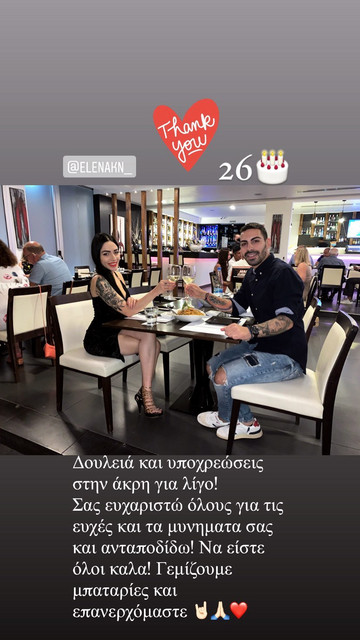 Ο ίδιος έβαλε μια άνω τελεία στις επαγγελματικές υποχρεώσεις του και γιόρτασε τα γενέθλιά του με την σύντροφό του, Έλενα Κανναουρίδου. Ένα ρομαντικό δείπνο σε εστιατόριο ήταν η μικρή έκπληξη με τον ίδιο να δημοσιεύει τρυφερές στιγμές στα social media
