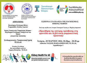 Ο Σύνδεσμος μας μέσα στις διάφορες εκδηλώσεις ενημέρωσης που διοργανώνει με ευκαιρία τη Παγκόσμια Ημέρα Νεφρού, θα διεξάγει Εσπερίδα σε συνεργασία με το Σύνδεσμο Νοσηλευτών και Μαιών Κύπρου/ Τομέας Νοσηλευτών Νεφρολογίας (ΠΑΣΥΝΜ/ΤΟΝΟΝΕ) και τη Νοσηλευτική Σχολή του ΤΕ.ΠΑ.Κ Λεμεσού, τη Τετάρτη 20 Μαρτίου 2024, στην αίθουσα του ΤΕΠΑΚ Λεμεσού μεταξύ των ωρών 6.30 μμ – 8.30 μμ..