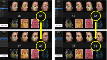 Εικόνα 3. Το VISIA παρακολουθεί τις αλλαγές του δέρματός και την αποτελεσματικότητα του εξατομικευμένου προγράμματος φροντίδας του προσώπου. Εδώ βλέπουμε το TrueSkin Age® να έχει μειωθεί κατά τέσσερα (4) χρόνια μετά την θεραπεία