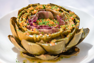 Globe Artichoke with Anchovy and Lemon Vinaigrette: Αυτό το πιάτο συνδυάζει την πλούσια γεύση της αγκινάρας με την οξύτητα του λεμονιού και την αλμυρή νότα των αντσούγιων, δημιουργώντας ένα εκλεπτυσμένο πρώτο πιάτο.