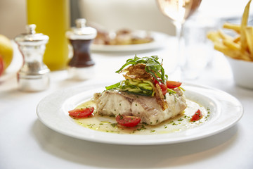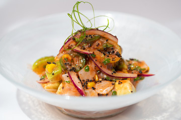 Seabass Ceviche: Ένα αναζωογονητικό πιάτο που συνδυάζει την ανάλαφρη γεύση του λευκού ψαριού με τη φρεσκάδα των λεμονιών και των μυρωδικών, παρέχοντας μια εκλεπτυσμένη εμπειρία γεύσης.