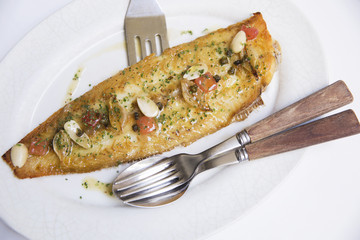 Pan Fried Dover Sole with Mustard and Almonds: Ένα πιάτο που συνδυάζει την τρυφερή και αρωματική γεύση του φρέσκου ψαριού με την ελαφριά πικάντικη νότα της μουστάρδας και την τραγανή υφή των αμυγδάλων.