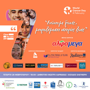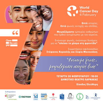 Στο πλαίσιο αυτό, ο Αντικαρκινικός Σύνδεσμος Κύπρου, ο Παγκύπριος Σύνδεσμος Καρκινοπαθών και Φίλων (ΠΑΣΥΚΑΦ), η Europa Donna Κύπρου, το Europa Uomo Κύπρου, το Καραϊσκάκειο Ίδρυμα, o Σύνδεσμος «Ένα Όνειρο, Μια Ευχή», το Ίδρυμα Χριστίνα Α. Αποστόλου, και ο Σύνδεσμος Διαιτολόγων και Διατροφολόγων Κύπρου, σε συνεργασία με το Ογκολογικό Κέντρο Τράπεζας Κύπρου, συμμετέχουν ενεργά και φέτος στην παγκόσμια εκστρατεία, με την εκδήλωση, η οποία είναι ανοικτή για το κοινό: «Ενώνουμε Φωνές: Μοιραζόμαστε ιστορίες Ζωής».