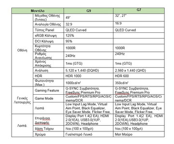 Τα 32’’ και 27’’ G7 monitors με κυρτότητα 1000R προσφέρουν στους gamers Wide Quad-High Definition (WQHD; 2,560×1,440 ανάλυση), 16:9 αναλογία οθόνης, 600 cd/m2 μέγιστη φωτεινότητα και Quantum dot τεχνολογία για αναπαραγωγή χρωμάτων, με υψηλή ακρίβεια, ανεξαρτήτως συνθηκών φωτισμού.