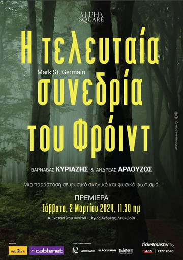 Στο ιδιαίτερο σαλόνι ενός σπιτιού, σχεδιασμένο από τον εμβληματικό Κύπριο αρχιτέκτονα Νεοπτόλεμο Μιχαηλίδη, μικρός αριθμός θεατών θα κάθεται μαζί με τις δύο ιστορικές φιγούρες στο «γραφείο του Φρόιντ» στο φυσικό φως της ημέρας! Οι Βαρνάβας Κυριαζής και Ανδρέας Αραούζος σκηνοθετούν και ενσαρκώνουν τις δύο επιβλητικές προσωπικότητες, σε διπλές παραστάσεις για όλα τα Σάββατα* και τις Κυριακές Μαρτίου, στις 11.30 το πρωί και στις 4 το απόγευμα.