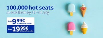 Είμαστε στην ευχάριστη θέση να ανακοινώσουμε την καλοκαιρινή μας καμπάνια που σας προσφέρει την ευκαιρία να κλείσετε 100.000 θέσεις με τη χαμηλότερη διαθέσιμη τιμή. Η προσφορά διαρκεί 4 ημέρες και οι τιμές των εισιτηρίων ξεκινούν από 9,99€ για εσωτερικά δρομολόγια της Ρουμανίας και από 19,99€ για διεθνή δρομολόγια.