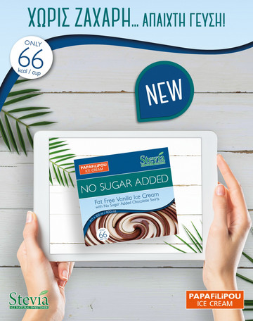 Τα αγαπημένα μας παγωτά, από το 1965, παρουσιάζουν σήμερα το νέο παγωτό No Sugar Added βανίλια Fat Free, με στροβιλίσματα σοκολάτας χωρίς ζάχαρη, με στέβια, προσφέροντας μία καινούρια γευστική εμπειρία με μόνο 66 θερμίδες και 1.9g λιπαρά ανά κύπελλο των 100ml. Η οικολογική πολύ-συσκευασία των 4 κυπέλλων των 100ml έχει τις λιγότερες συνολικά θερμίδες και λιπαρά στην αγορά στην κατηγορία παγωτά χωρίς ζάχαρη σε πολύ-συσκευασίες!