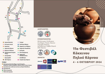 Το Δημοτικό Διαμέρισμα Κόρνου και ο Δήμος Λευκάρων, με μεγάλο ενθουσιασμό, διοργανώνουν και σας προσκαλούν στο 11ο Φεστιβάλ Κόκκινου πηλού, που θα λάβει χώρα στα γραφικά δρομάκια του χωριού, από τις 4 μέχρι τις 6 Οκτωβρίου 2024, στον Κόρνο.