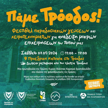 Ένα νέο φεστιβάλ κάνει την εμφάνισή του στην Κύπρο, φέρνοντας στο προσκήνιο τις τοπικές μικρές επιχειρήσεις και τις μοναδικές γεύσεις του τόπου μας. Το Σάββατο 7 Σεπτεμβρίου, η προεδρική κατοικία στο Τρόοδος θα φιλοξενήσει το πρώτο Φεστιβάλ Παραδοσιακών Γεύσεων και Χειροτεχνημάτων, μια πρωτοβουλία που ξεκίνησε από την Πρώτη Κυρία, κα Φιλίππα Καρσερά Χριστοδουλίδη, στο πλαίσιο των φιλανθρωπικών της δράσεων.