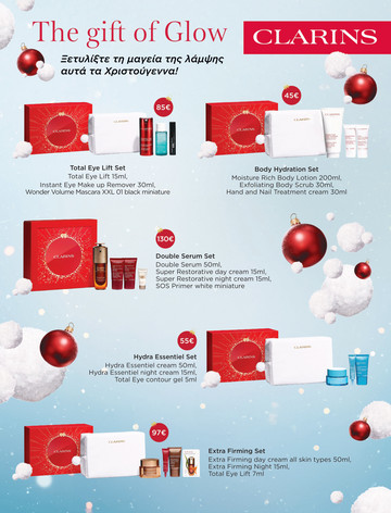 Και αν θες ένα δώρο συνώνυμο του glow και των Χριστουγέννων, η εταιρεία Clarins σου προσφέρει εξίσου ξεχωριστούς συνδυασμούς με μια συσκευασία άκρως Χριστουγεννιάτικη που θα αγαπήσεις και με επιλογές που καλύπτουν διαφορετικά budget. Aπό το Hydra Essentiel Set με το στιλάτο λευκό τσαντάκι που αγαπάμε μέχρι το Double Serum Set για τις πιο απαιτητικές λύσεις, θα βρεις επιλογές που θα αγαπήσεις φέτος τα Χριστούγεννα.