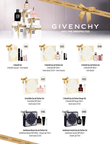Gift the unexprected για την Givenchy που δεν μπορούσαμε να μην την έχουμε στη λίστα μας ως κορυφαία επιλογή. Άρωμα, travel spray, shower gel, μάσκαρα, ξεχωριστά αλλά και σε συνδυασμούς δίνουν ένα combination που θα απογειωθεί το στυλ και την ομορφιά κάθε γυναίκας και άνδρα.