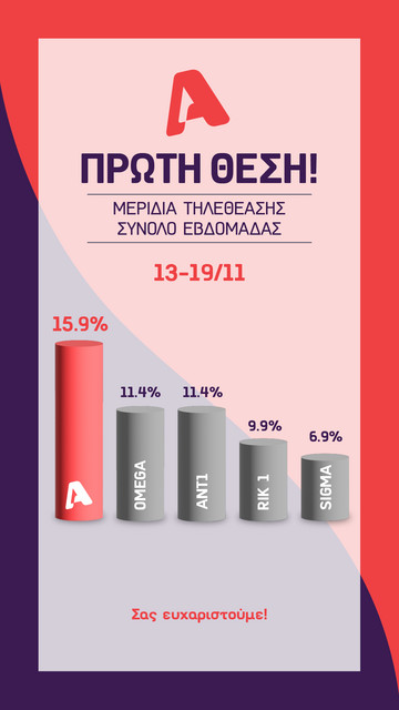 Σύμφωνα με τα επίσημα στοιχεία της Nielsen για το διάστημα 13-19 Νοεμβρίου ο ALPHA Κύπρου ήταν πρώτος σε τηλεθέαση στο Σύνολο του Πληθυσμού με ποσοστό 15,9%, στην δεύτερη θέση ήταν ο ΑΝΤ1 σε ισοβαθμία με το Omega με 11,4% , στην τέταρτη θέση ήταν το ΡΙΚ1 με 9,9% και στην πέμπτη θέση ήταν το Sigma με 6,9%. Η πέμπτη θέση με την πρώτη απέχει σε ένα εντυπωσιακό 9% διαφορά δείχνοντας ότι η τηλεοπτική προτίμηση έχει μόνο έναν δρόμο, τον… Alpha!