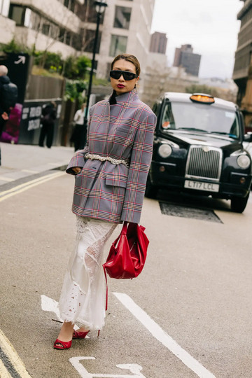 Στους δρόμους του Λονδίνου, εμφανίστηκε σε φορέματα, πουκάμισα αλλά και φούστες, συνδυασμένο με minimal basics ή πιο edgy κομμάτια όπως leather jackets και sneakers για ένα πιο σύγχρονο αποτέλεσμα.