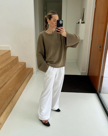 Λινό λευκό παντελόνι με καμηλό πλεκτό