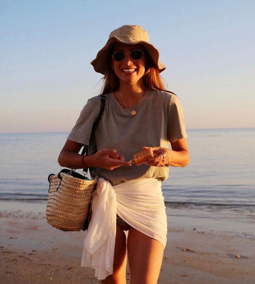 Λευκό παρεό και γκρί T-shirt. Συνδυάζεται με ένα bucket καπέλο.