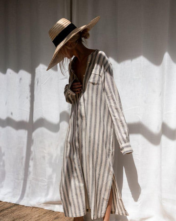 Λινο shirt dress με ρίγες με ψάθινο καπέλο