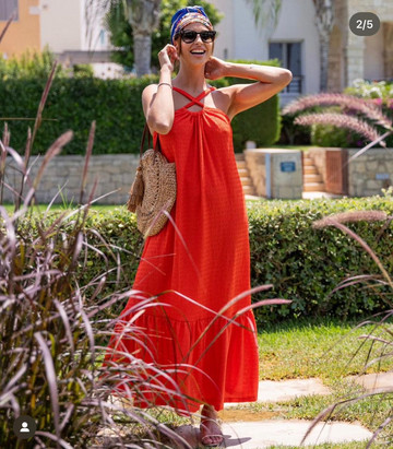 Λινό μαξί φόρεμα, συνδυασμένο με το hot item του καλοκαιριού στο κεφάλι, το headband και ψάθινη μεγάλη τσάντα