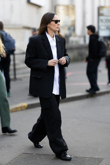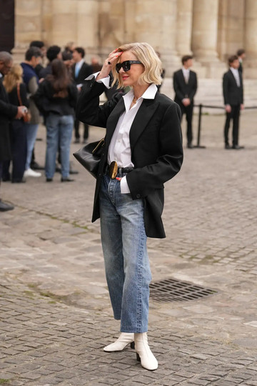 Για την περίσταση, η Naomi Watts επέλεξε ένα σύνολο που θα μπορούσε να θεωρηθεί η επιτομή της παριζιάνικης αισθητικής. Φόρεσε ένα μαύρο σακάκι από τη συλλογή Άνοιξη-Καλοκαίρι 2026 της Celine, με ελαφρώς τονισμένους ώμους και εφαρμοστή μέση, το οποίο συνδύασε με ένα λευκό πουκάμισο φορεμένο χαλαρά και με τα μανίκια ελαφρώς γυρισμένα.