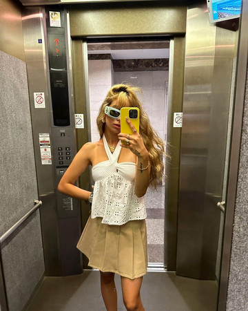 Η Μαρία Κορτζιά φόρεσε πρόσφατα το λευκό halterneck top της με τις eyelet embroidery λεπτομέρειες και το συνδύασε με μπεζ μίνι πλισέ φούστα.