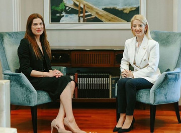 Στην πρόσφατη συνάντηση της με κύρια Νατάσα Πηλείδου, η Αννίτα Δημητρίου δημιούργησε ένα κομψό, ανοιξιάτικο σύνολο με items που σίγουρα υπάρχουν και στην δική σου γκαρνταρόμπα. Επέλεξε ένα σκούρο navy παντελόνι σε ίσια γραμμή και το συνδύασε με ένα λευκό πουκάμισο από μέσα και double breasted λευκό blazer από πάνω με χρυσά κουμπιά.