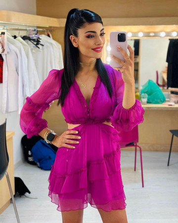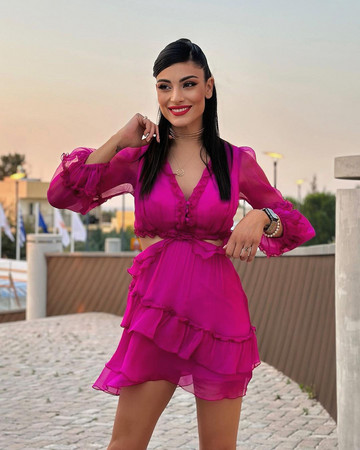 Με τη βοήθεια της στυλίστριάς της, Καρολίνας Αντωνίου έκανε ένα girly και stylish look, που μας εμπνέει για τις εμφανίσεις μας στις εξόδους του καλοκαιριού. Συγκεκριμένα, η Άντρεα Καφά φόρεσε ένα φόρεμα με ruffles σε βιολετί χρώμα, της εταιρείας Zini, με μακριά μανίκια και cut-out λεπτομέρεια στη μέση.