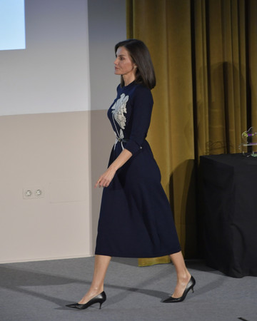 Συγκεκριμένα, πόνταρε σε ένα μπλε midi φόρεμα της ισπανικής μάρκας Galcon, το οποίο ξεχώριζε χάρη στπ λευκό λουλουδάτο μοτίβο του. Την εμφάνιση της ολοκλήρωναν ένα ζευγάρι kitten heels τα οποία ενίσχυαν την διακριτική κομψότητα του συνόλου της.