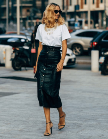 Μπορεί να είμαστε στην αρχή του φθινοπώρου ανυπομονούμε όμως να φορέσουμε ξανά τα δερμάτινα- είτε σε τζάκετς, είτε σε φούστες, είτε σε παντελόνια . Εδώ έχουμε έναν υπέροχο συνδιασμό, με black leather midi φούστα πολύ σωστά συνδιασμένο λευκό cotton μπλουζάκι και μαύρα πέδιλα. Εσύ μπορείς να το φορέσεις με μαύρο μποτάκι- προσαρμοσμένο πάντα στον σωματότυπο της κάθε γυναίκας- , γόβα- για πιο formal αποτέλεσμα αλλά και sneaker -ταιριάζει καλύτερα σε πιο ψιλόλιγνους σωματότυπους.