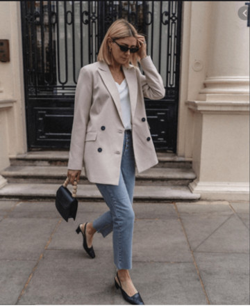 Το απόλυτο office look σε μια εικόνα. Απαρτίζεται από ένα blue jean- ένα κομμάτι που όλες έχουμε στην γκαρνταρόμπα μας- ένα λευκό μπλουζάκι και ενα μπεζ oversized blazer. Μετά προσθέτουμε τα μάυρα mules και ότι τσάντα ταιριάζει στην διάθεση σας.