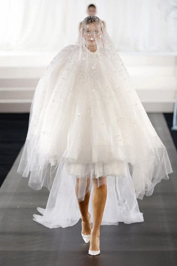 Και έπειτα εμφανίζεται η νυφική δημιουργία. Από τις πιο εντυπωσιακές που έχω δει ποτέ σε catwalk – και πιστέψτε με έχω βρεθεί σε δεκάδες. Ένα φόρεμα από αιθέριο λευκό μεταξωτό τούλι, διαμέτρου τριών μέτρων. Σχεδόν αδύνατο να το συλλάβεις με το μάτι.