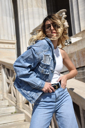 Αντί για το κλασικό τζιν μπουφάν σου, επέλεξε ενά denim jacket με μια glam λεπτομέρεια. Φόρεσέ το με ένα απλό μπλουζάκι και ένα ψηλόμεσο παντελόνι.
