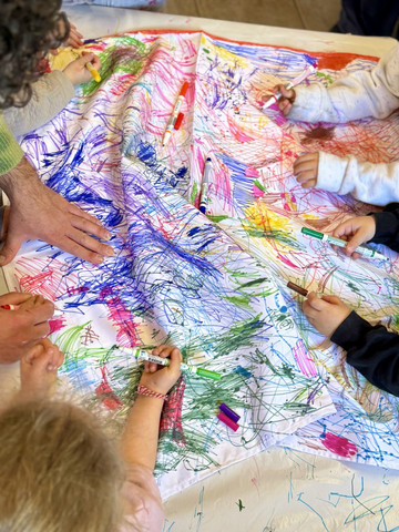 Καθώς τα παιδιά ζωγράφιζαν μαζί, τα φουλάρια γέμιζαν με παιχνιδιάρικα σχέδια, έντονα χρώματα και αυθόρμητες πινελιές, δημιουργώντας μικρά έργα τέχνης γεμάτα χαρά και δημιουργικότητα.