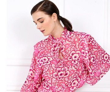 Συγκεκριμένα, η παρουσιάστρια επέλεξε ένα wide-leg denim παντελόνι σε έντονη ροζ-μωβ απόχρωση και το συνδύασε με ένα υπέροχο φλοράλ πουκάμισο που ξεχώριζε όχι μόνο για το floral μοτίβο του αλλά και για την neck-tie λεπτομέρεια του, που πρόσδιδε μια κοριτσίστικη νότα στο outfit.