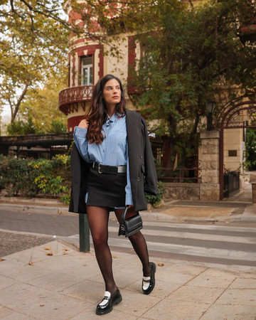 Πιο συγκεκριμένα, η Χριστίνα Μπόμπα φόρεσε ένα γαλάζιο striped πουκάμισο με μαύρη φούστα, blazer και loafers. Αυτό που μας άρεσε στο chic outfit της Χριστίνας ήταν η επιλογή της να βάλει το πουκάμισό της μέσα από τη φούστα και έτσι, μπορούσαμε να δούμε το πουκάμισό της, που είχε πιο μακρύ μήκος, κάτω από τη φούστα. Το στυλιστικό της τρικ έδωσε έναν άλλον αέρα στην εμφάνισή της και μπορούμε να το υιοθετήσουμε κι εμείς στα δικά μας looks.