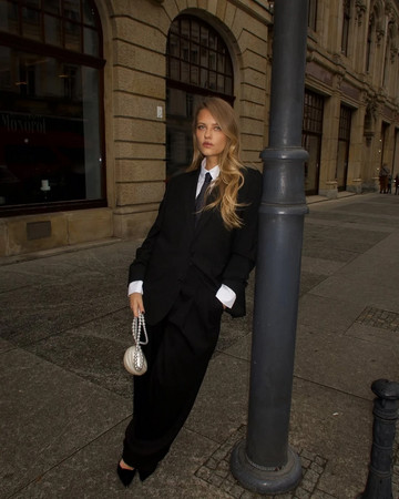 Τα ανδρόγυνα κοστούμια αποκτούν μια πιο γιορτινή διάθεση με την προσθήκη γραβάτας. Το oversized κόψιμο προσφέρει άνεση και στυλ, ενώ το layering με σατέν τοπ ή bralette από κάτω προσθέτει μια θηλυκή πινελιά. Οι ουδέτερες αποχρώσεις, όπως το γκρι και το λευκό, είναι ιδανικές για να αναδείξουν την κομψότητα αυτού του look.