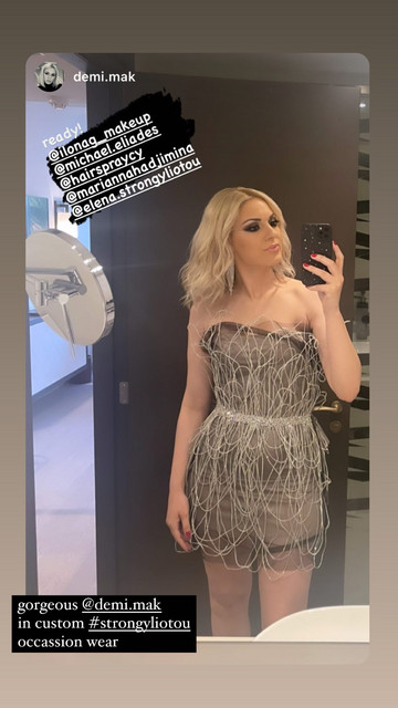 Συγκεκριμένα η παρουσιάστρια του Alpha, Δήμητρα Μακρυγιάννη με τη βοήθεια της στιλίστριας Μαριάννας Χατζημηνά, επέλεξε ένα μίνι custom-made φόρεμα το οποίο ήταν κατασκευασμένο από οργάντζα και ξεχώριζε χάρη στο ιδιαίτερο 3D σχέδιο που σχημάτιζαν οι glittery λωρίδες στο μπροστινό μέρος.