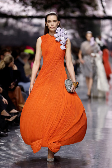 Ιαπωνικές επιρροές, εμπνευσμένες από το έργο του Hiroshi Sugimoto, αποτυπώθηκαν τόσο στα φορέματα όσο και στα hair styles, προσδίδοντας μια εξωτική, σχεδόν διαλογιστική διάσταση στη συλλογή. Βελούδινα κομμάτια με ασιατικά floral μοτίβα συνυπήρχαν με μάλλινα στοιχεία — μια υφή που ο Anderson αγαπά ιδιαίτερα — συνδυασμένα με μεταξωτά υλικά και εντυπωσιακά floral ear cuffs.