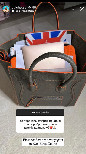 Σε πρόσφατο Q&A της λοιπόν, η παρουσιάστρια δέχθηκε ερώτηση για την τσάντα που χρησιμοποιεί καθημερινά. Συγκεκριμένα, η Δούκισσα αποκάλυψε πως η τσάντα που χρησιμοποιεί είναι τεράστια για να χωράει όλα της τα πράγματα και είναι του οίκου Celine.