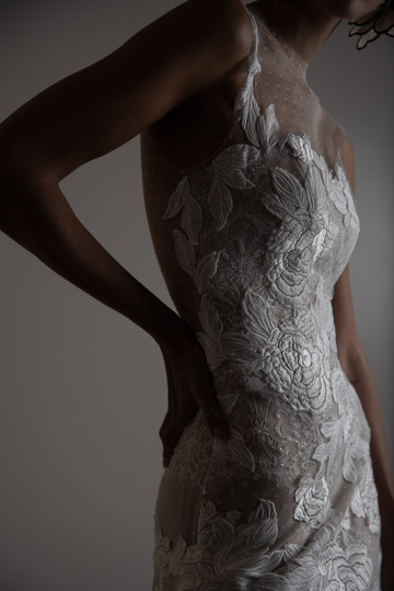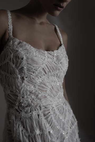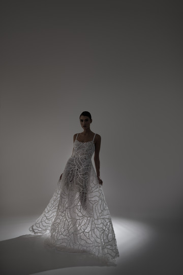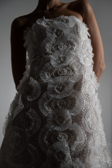 Τα κεντήματα με μεταξωτή κλωστή δίνουν μια αίσθηση μεγαλοπρέπειας, ενώ η γαλλική δαντέλα σε διάφορες εκδοχές προσδίδει vintage αύρα. Η δαντέλα κιπούρ σε ιδιαίτερα σχέδια μεταμορφώνεται με γεωμετρικές σιλουέτες ενώ οι διαφάνειες στις ογκώδεις φούστες, σχηματίζουν αέρινες φόρμες με το φως να διαπερνά τα φίνα υφάσματα.