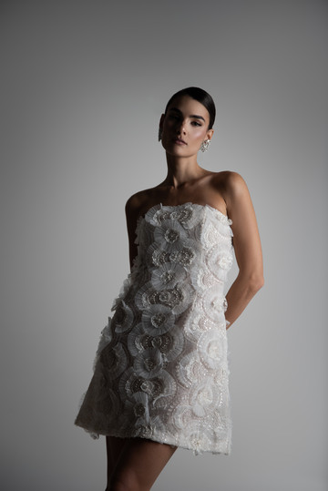 Οι νυφικές δημιουργίες που μετατρέπονται σε party dresses, έχουν σημαντική παρουσία στη νέα συλλογή της Έλενας Στρογγυλιώτου και απευθύνονται σε όσες επιλέγουν να έχουν περισσότερες από μια εμφανίσεις στο γάμο τους. Αποσπώμενες φούστες μεταμορφώνουν μια ρομαντική νυφική δημιουργία, σε μίνι φόρεμα για το γαμήλιο πάρτι.