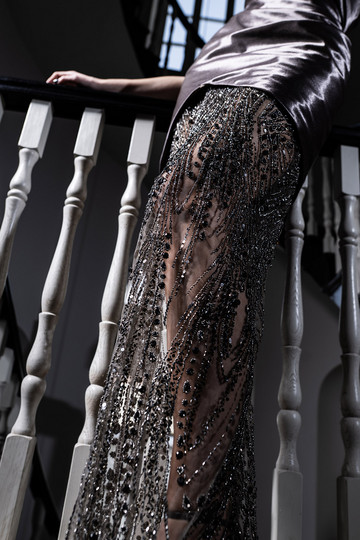Τα κεντημένα υφάσματα με χάντρες και κρύσταλλα Swarovski προσδίδουν σε κάθε δημιουργία τρισδιάστατη υφή, βάθος και έντονη αντανάκλαση φωτός ενισχύοντας την couture και τη red carpet αισθητική.