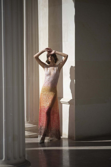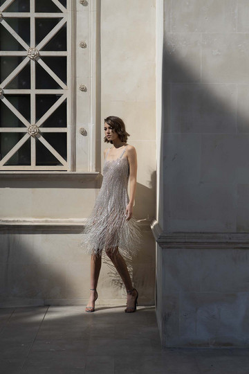 Αέρινα φορέματα σε μακριά γραμμή με πολυτελή μεταξωτά σατέν υφάσματα, φορέματα με κρόσσια σε μακριά ή κοντή γραμμή, μίντι φορέματα, δημιουργίες με φτερά, shiny υφάσματα και εντυπωσιακές πέτρες αλλά και διαφάνειες. Στη συλλογή πρωταγωνιστούν επίσης τα εντυπωσιακά κεντήματα που σχεδιάζει η ίδια η σχεδιάστρια και ξεχωρίζουν για την έμφαση στη λεπτομέρεια και τη μοναδικότητα τους.